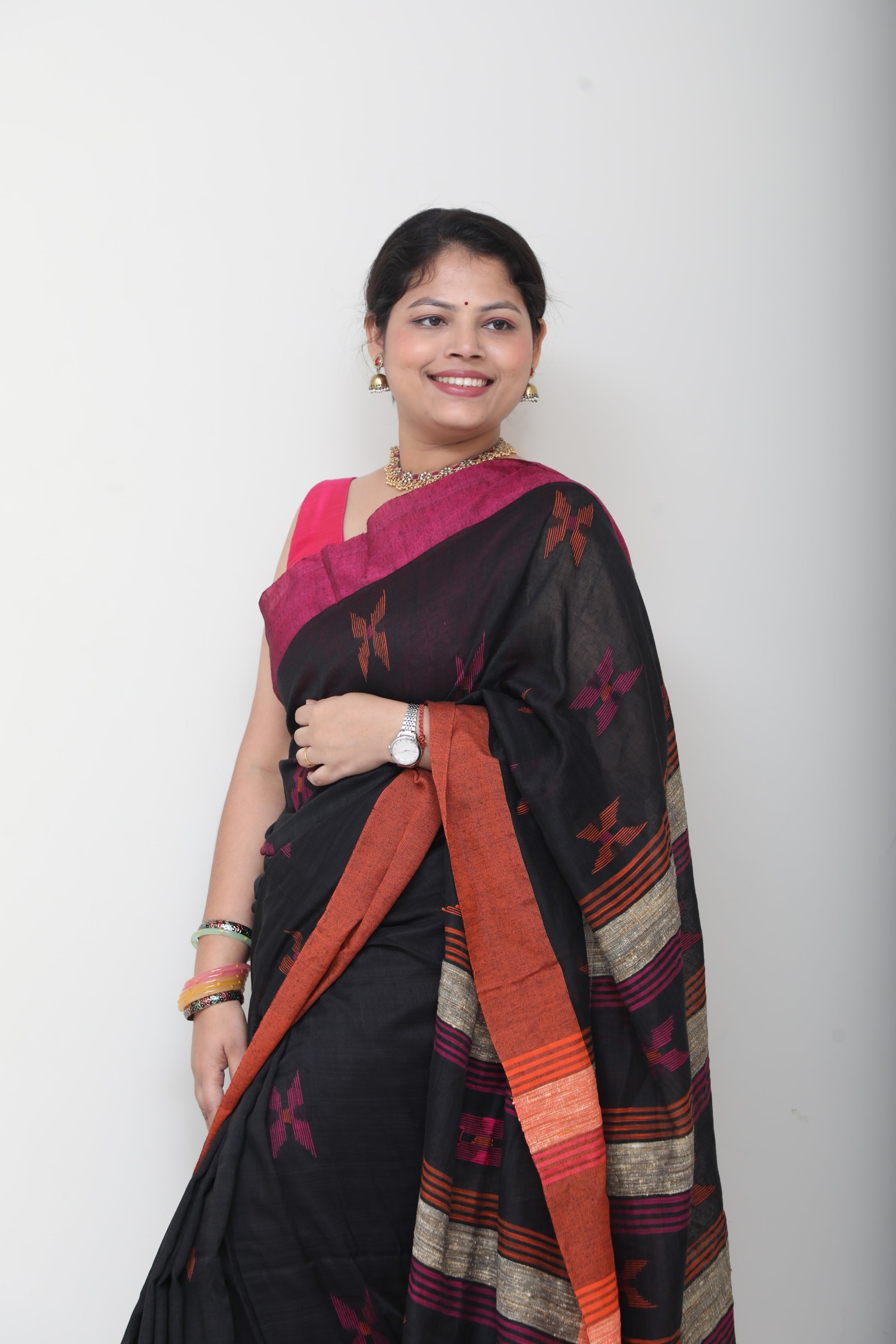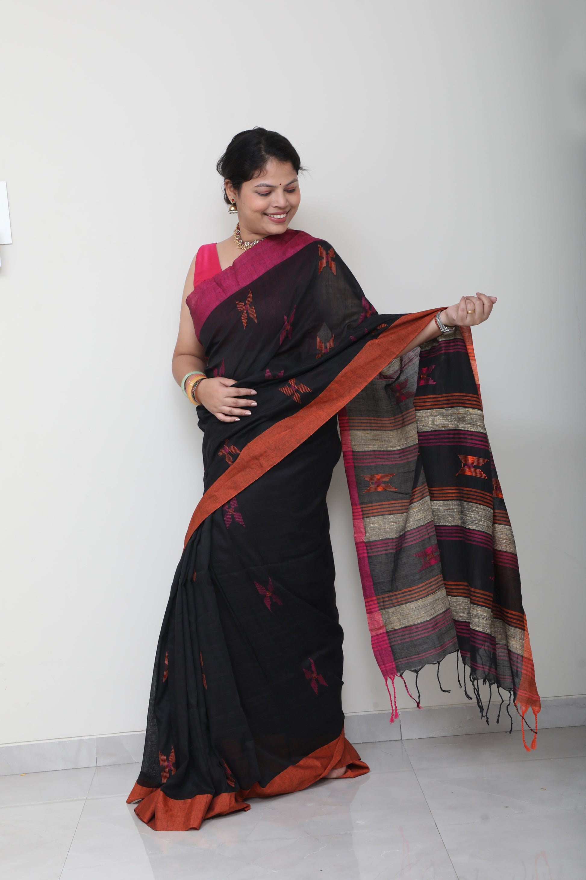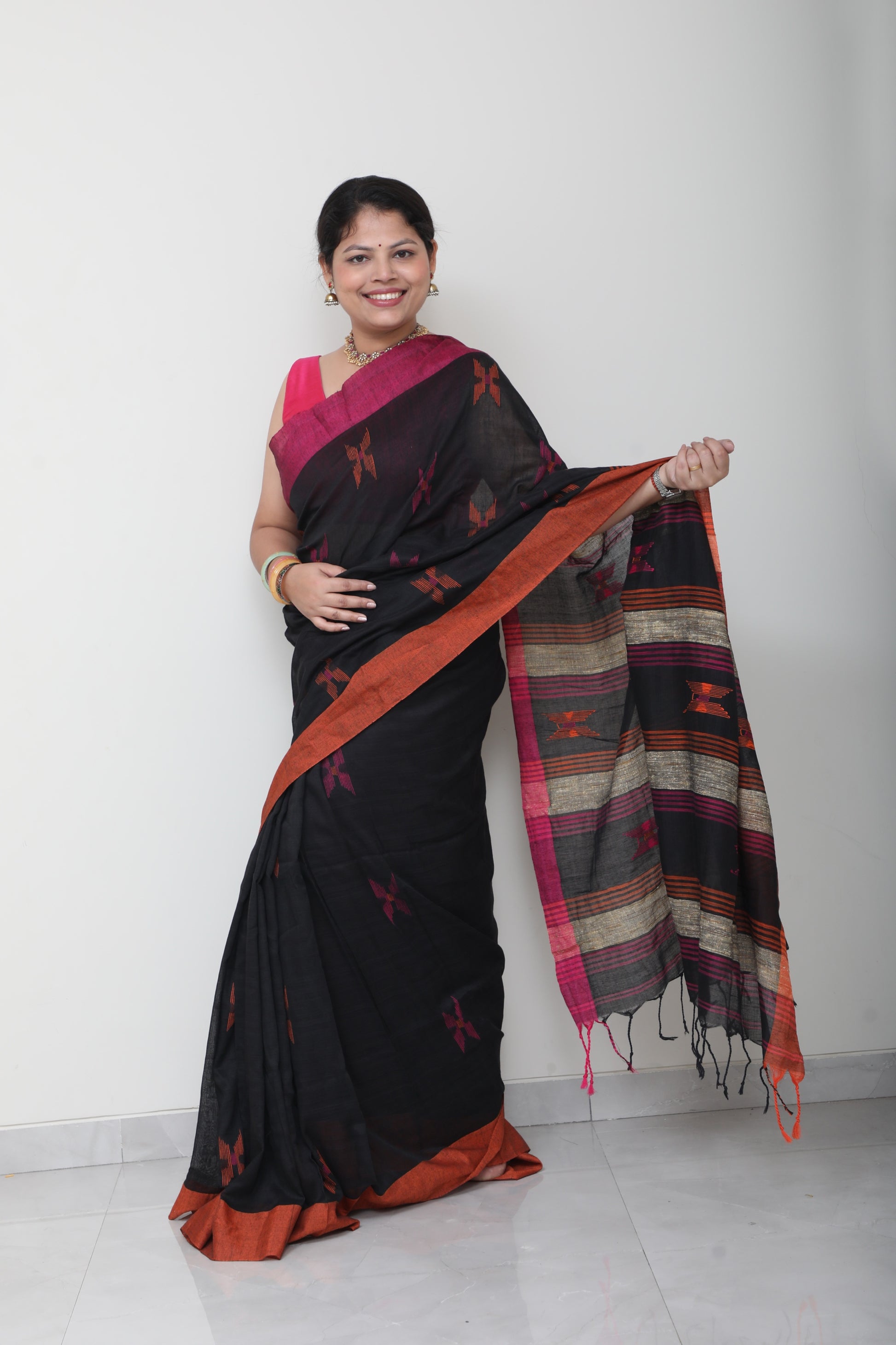 Rooted in handloom tradition, this pure cotton saree celebrates simplicity with a hint of whimsy. The breathable weave keeps it effortless for all-day wear, while the small, thoughtfully placed embroidery motifs bring in a sense of warmth and personality like little stories stitched into fabric.