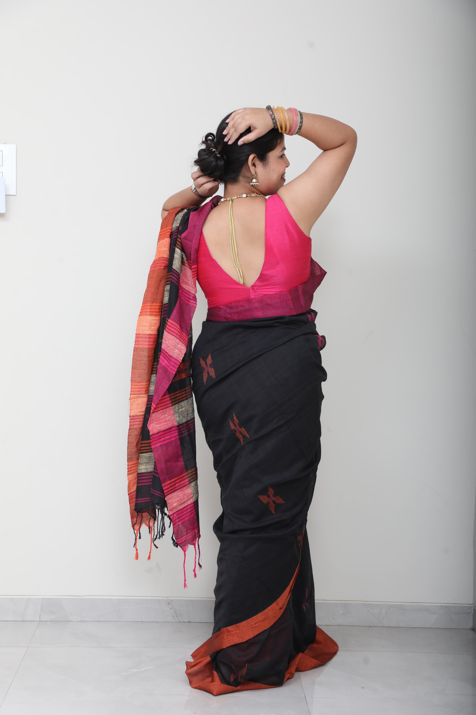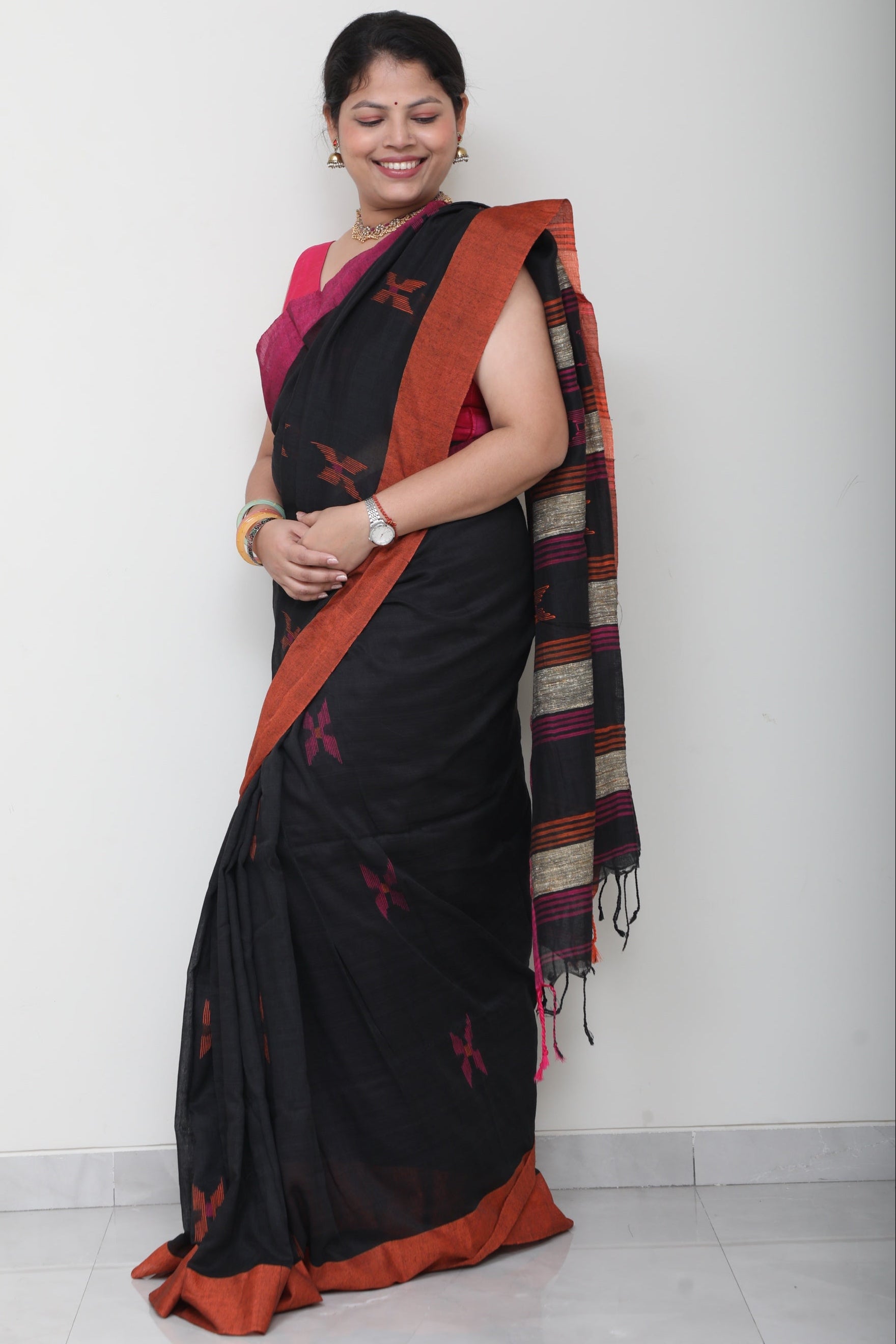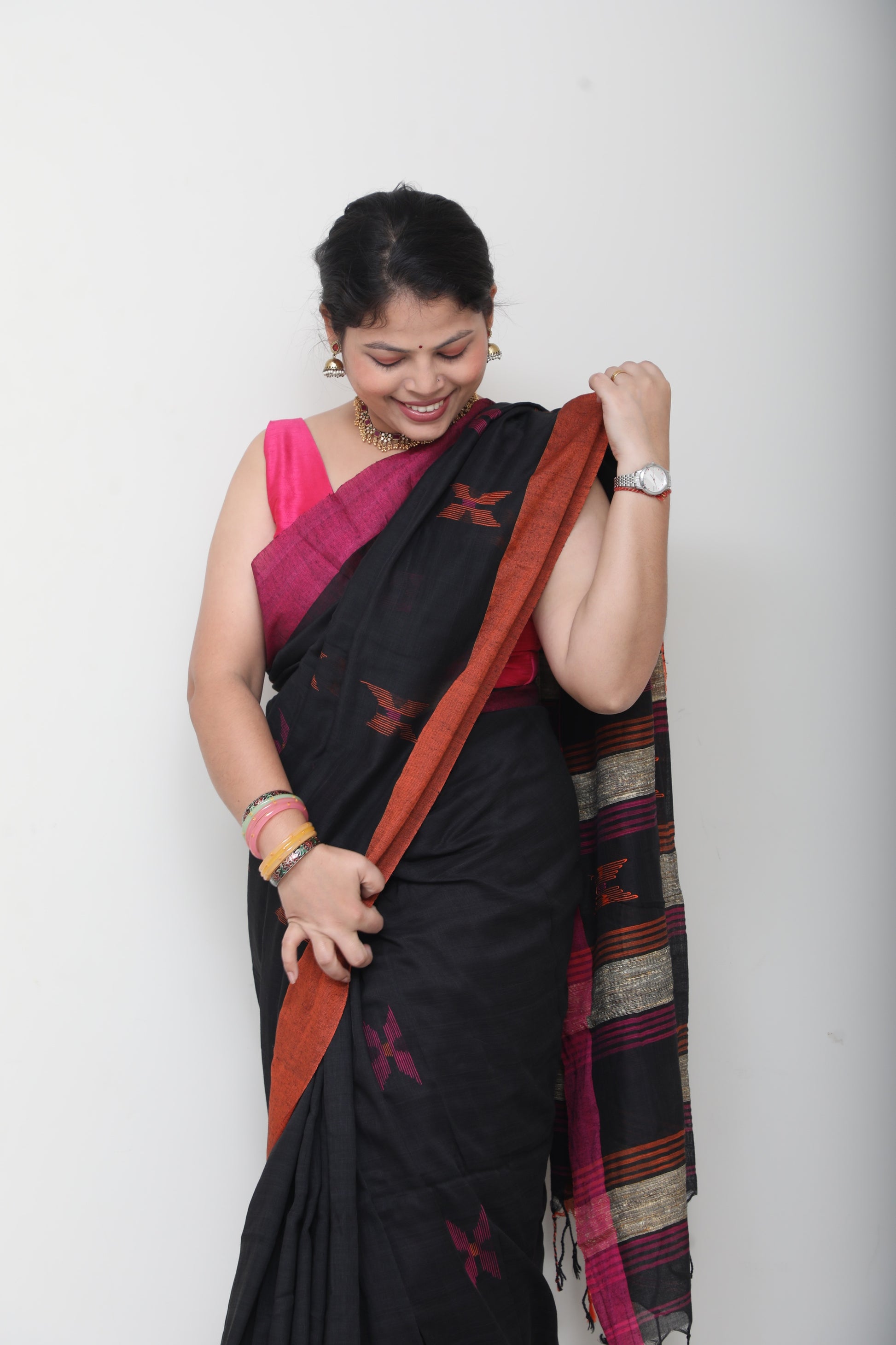 Rooted in handloom tradition, this pure cotton saree celebrates simplicity with a hint of whimsy. The breathable weave keeps it effortless for all-day wear, while the small, thoughtfully placed embroidery motifs bring in a sense of warmth and personality like little stories stitched into fabric.